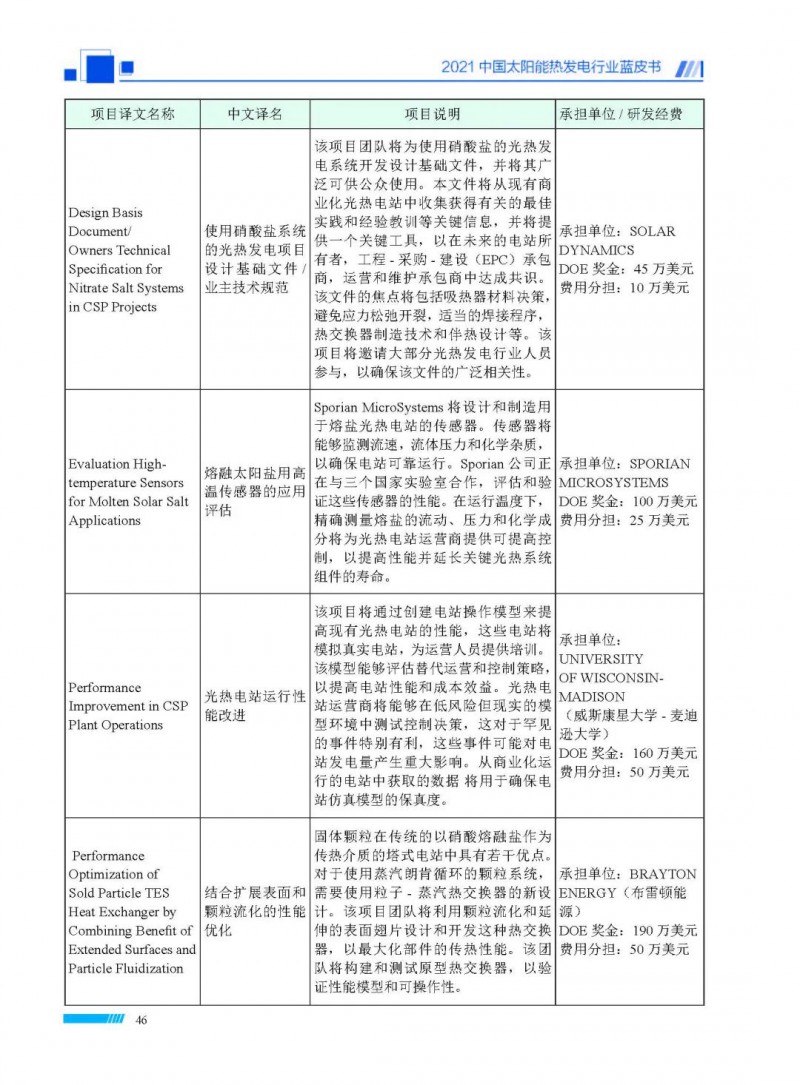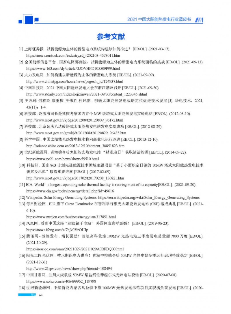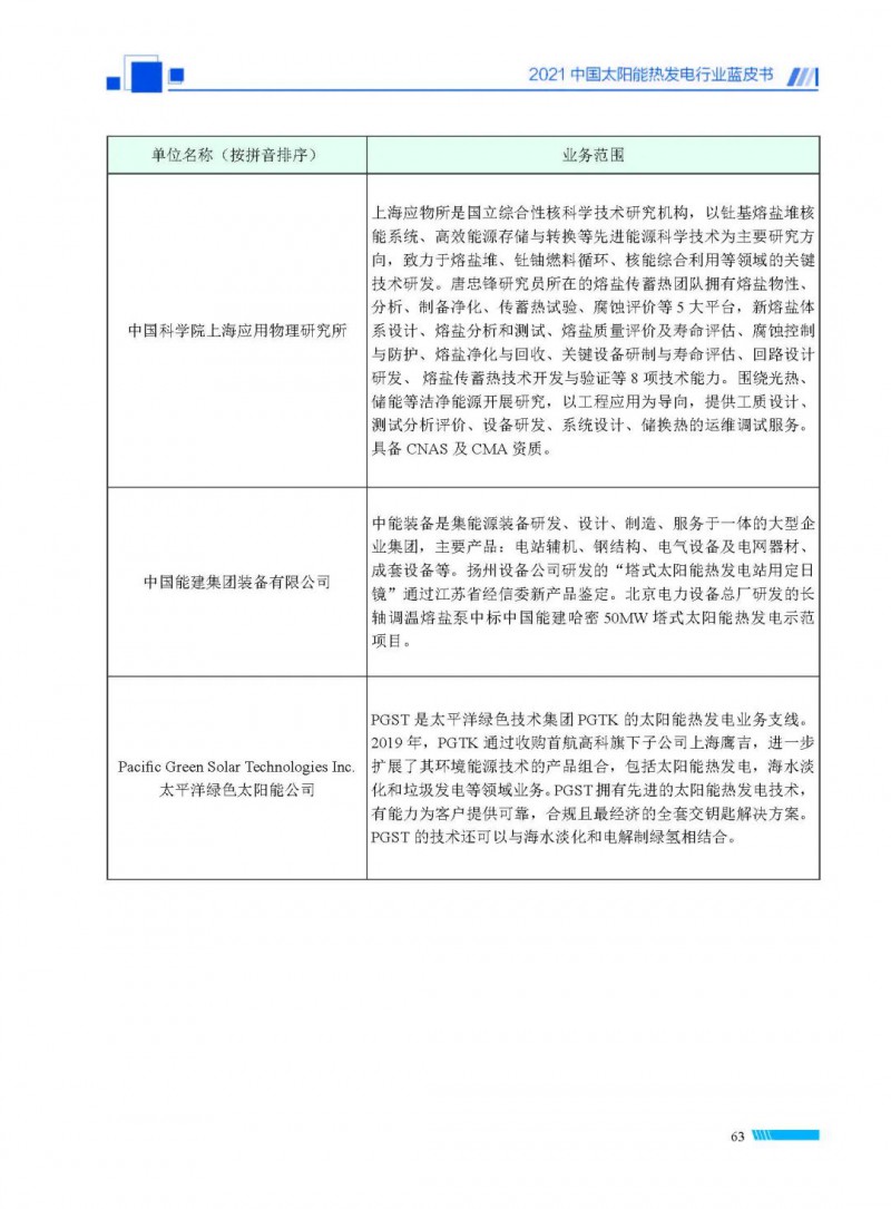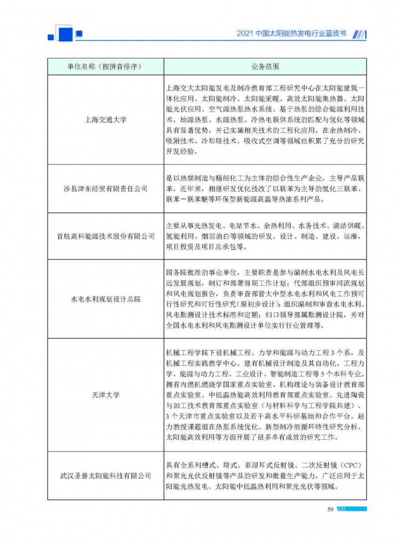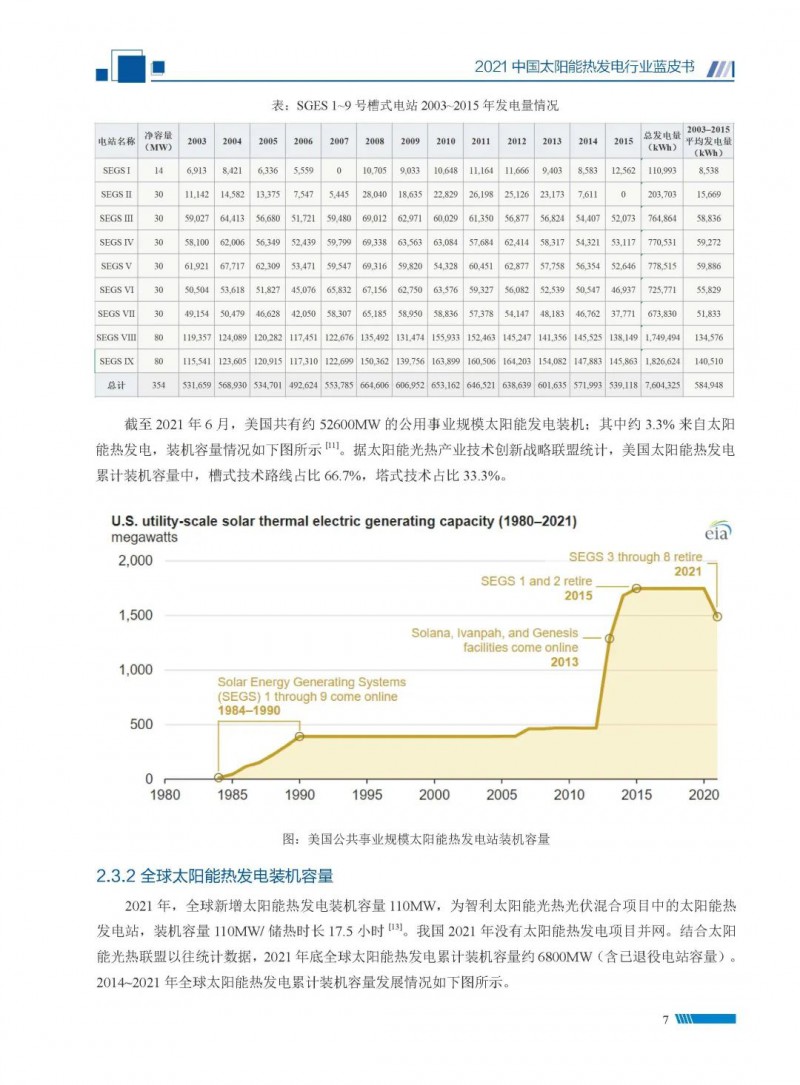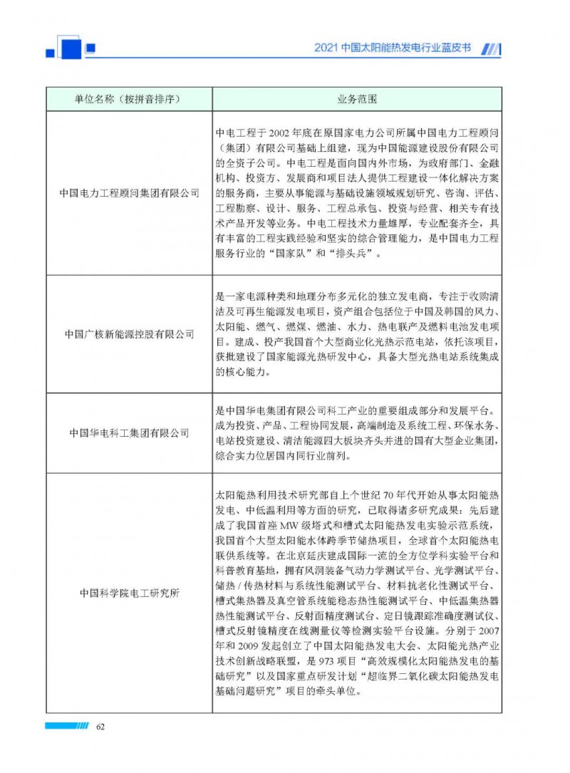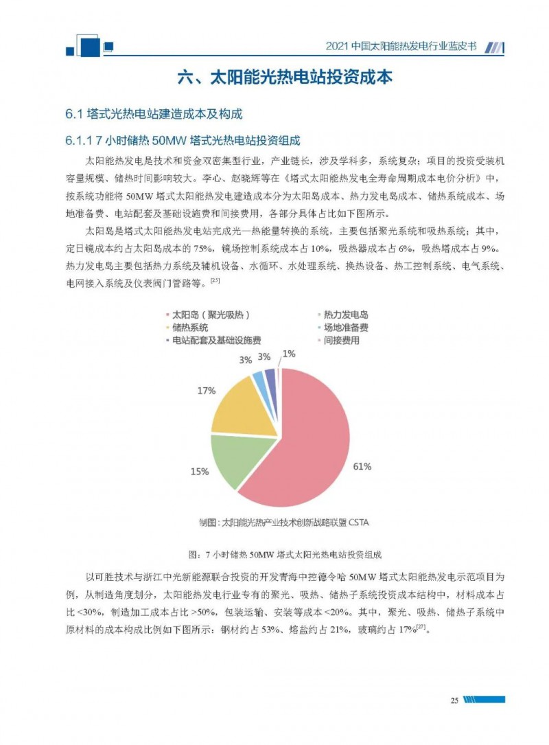 2021中國(guó)太陽(yáng)能熱發(fā)電行業(yè)藍(lán)皮書(shū)(以下簡(jiǎn)稱“藍(lán)皮書(shū)”)共分為9個(gè)章節(jié),分別為:太陽(yáng)能熱發(fā)電的發(fā)展機(jī)遇和定位、太陽(yáng)能熱發(fā)電市場(chǎng)發(fā)展、我國(guó)太陽(yáng)能熱發(fā)電示范項(xiàng)目運(yùn)行情況、我國(guó)太陽(yáng)能熱發(fā)電產(chǎn)業(yè)鏈情況、我國(guó)太陽(yáng)能熱發(fā)電研發(fā)項(xiàng)目情況、太陽(yáng)能熱發(fā)電投資成本、太陽(yáng)能熱發(fā)電站全生命周期碳排放、太陽(yáng)能熱發(fā)電發(fā)展面臨的挑戰(zhàn)及對(duì)策,以及附錄。附錄主要包括:我國(guó)2021年發(fā)布的太陽(yáng)能熱發(fā)電項(xiàng)目政策、美國(guó)能源部2021年度支持的太陽(yáng)能熱發(fā)電項(xiàng)目清單、2021年發(fā)布的太陽(yáng)能熱發(fā)電相關(guān)國(guó)家標(biāo)準(zhǔn)、我國(guó)太陽(yáng)能熱發(fā)電行業(yè)發(fā)展主要?dú)v程、太陽(yáng)能光熱聯(lián)盟理事成員單位及業(yè)務(wù)范圍名錄。全文4.5萬(wàn)+字,共55張圖表。