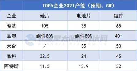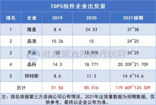 梳理2017年~2021年連續(xù)5年全球組件出貨量排名,TOP5企業(yè)巋然不對(duì),僅排序略有變化。2019年,TOP5企業(yè)即隆基、晶科、天合、晶澳、阿特斯5家企業(yè)組件總出貨量51.56GW,2020年這一數(shù)字增長(zhǎng)至85.5GW,而2021年再攀高峰突破120GW。據(jù)BNEF彭博新能源財(cái)經(jīng)預(yù)測(cè),2021年全球光伏新增裝機(jī)或達(dá)183GW。這也意味著TOP5組件企業(yè)的市場(chǎng)占比達(dá)到六成以上。