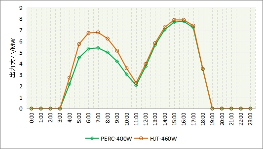 由于組件正面朝西,背面朝東,上午時刻,組件背面接收輻射,由于異質(zhì)結(jié)組件的雙面率較高,因此總體出力大小高于PERC組件。到了下午,太陽照射在組件的正面,雖然背面的輻射接收量較小,但是異質(zhì)結(jié)組件的出力大小仍略高于PERC組件。