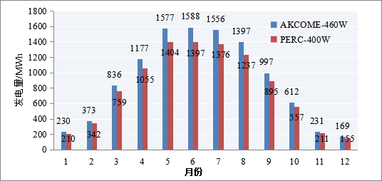 根據(jù)模擬結(jié)果,PERC400W組件及異質(zhì)結(jié)460W雙面組件的首年月份發(fā)電對比結(jié)果如圖2所示,在3月至9月,異質(zhì)結(jié)組件的發(fā)電提升較為明顯,而在10月至次年2月,差異較小。