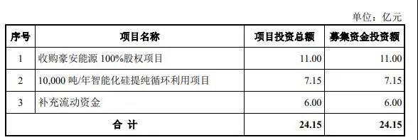 同時,公告顯示,公司擬非公開發(fā)行股票募資不超24.15億元,用于收購豪安能源100%股權、1萬噸/年智能化硅提純循環(huán)利用項目及補充流動資金。