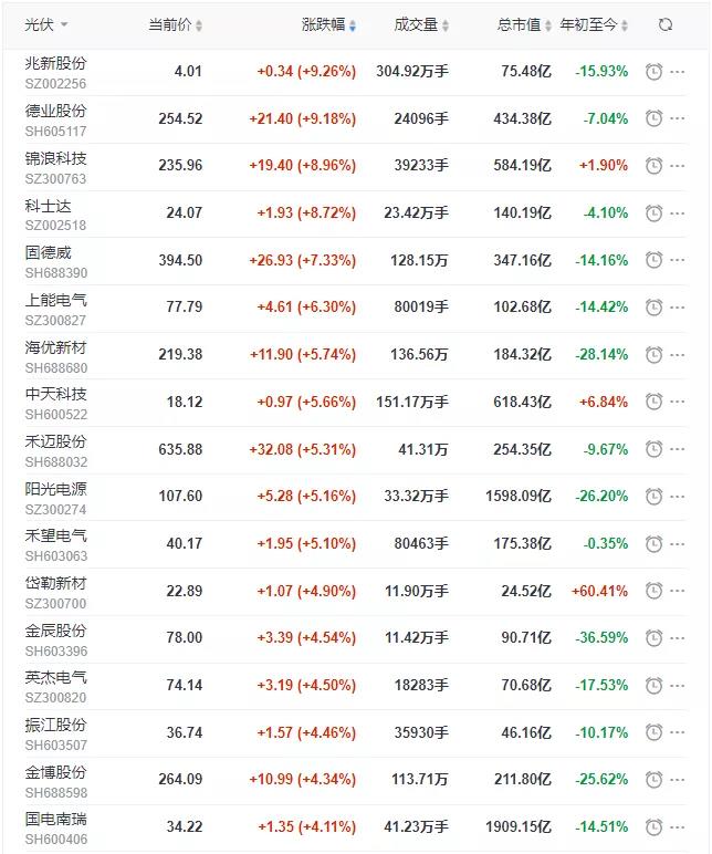 個(gè)股方面,兆新股份、德業(yè)股份漲超9%,錦浪科技漲幅達(dá)到8.96%,固德威漲超7%,上能電氣漲超6%,禾邁股份、陽光電源等漲超5%,天合光能、賽伍技術(shù)、中來股份、通威股份、晶澳科技等漲超3%,正泰電器、中信博、特變電工、高測股份、隆基股份等漲超2%,邁為股份、愛旭股份、通靈股份、東方日升等漲超1%。