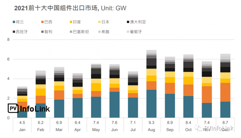 美洲、中東與非洲地區(qū)2021分別從中國(guó)進(jìn)口了16.6、6.4、2.5GW的組件,三個(gè)區(qū)域市場(chǎng)的總占比來到了29%。因?yàn)?020年總量較小,基期較低的緣故,同比成長(zhǎng)明顯,分別達(dá)到了66、60、49%。超過GW級(jí)的進(jìn)口國(guó)家包含了美洲的巴西、智利、墨西哥;中東的巴基斯坦、以色列;非洲的南非。其中巴西為2021年中國(guó)出口組件第二名的國(guó)家,總量來到了11.3GW。