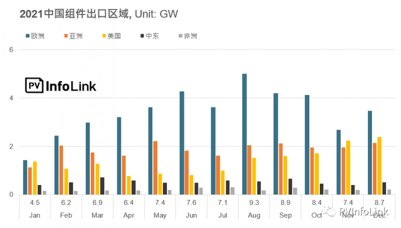 亞洲市場(chǎng)是從23.3GW微幅下降到22.4GW,2021全年占比下降為25%,但仍是中國(guó)組件出口的第二大市場(chǎng),GW級(jí)進(jìn)口國(guó)包括印度、日本、澳大利亞和泰國(guó),韓國(guó)與馬來西亞也有接近1GW的進(jìn)口量。2020年亞洲從中國(guó)進(jìn)口最多組件的越南則是在補(bǔ)貼政策結(jié)束后進(jìn)口量快速減少,從原本的最大進(jìn)口國(guó)下降到僅有0.4GW的進(jìn)口量。