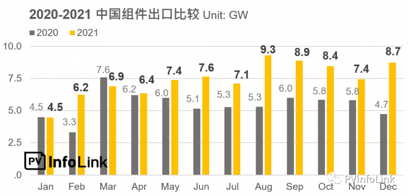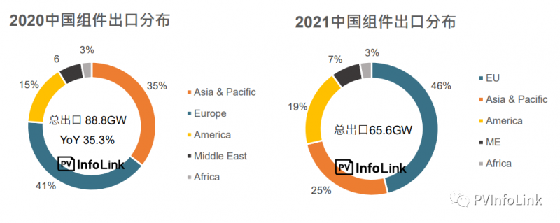 2021光伏產(chǎn)業(yè)面臨動(dòng)蕩的一年,歷經(jīng)了多晶硅暴漲,以及中國(guó)的能耗管控政策,供應(yīng)鏈價(jià)格劇烈波動(dòng),但全球光伏裝機(jī)仍是繳出了優(yōu)異的成績(jī)。根據(jù)PV Infolink統(tǒng)計(jì),2021年的全球光伏新增裝機(jī)容量達(dá)到172.6 GW,同比成長(zhǎng)23.1%,其中,非中國(guó)市場(chǎng)的裝機(jī)量來到了124.6GW,同比成長(zhǎng)了30.1%。海外需求的快速成長(zhǎng)也帶動(dòng)了中國(guó)光伏組件的出口,根據(jù)PV Infolink統(tǒng)計(jì)中國(guó)海關(guān)出口資料,中國(guó)在2021出口組件總量來到了88.8GW,同比增長(zhǎng)了35.3%。主要的成長(zhǎng)來源仍是歐洲、巴西和印度等主要光伏市場(chǎng)。