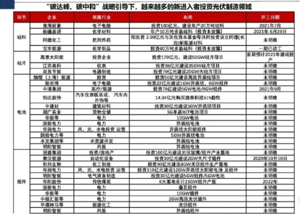 近年來光伏產(chǎn)業(yè)發(fā)展迅速,疫情、產(chǎn)業(yè)鏈漲價(jià)等因素下仍屢創(chuàng)新高,跨界入局者屢見不鮮,成功者也不在少數(shù),前有華為的逆變器、比亞迪的組件,后有高景的硅片、金陽新能源的異質(zhì)結(jié),吉利、順豐、長城、同德化工、海螺水泥、和邦生物等實(shí)力玩家也紛紛入場。
