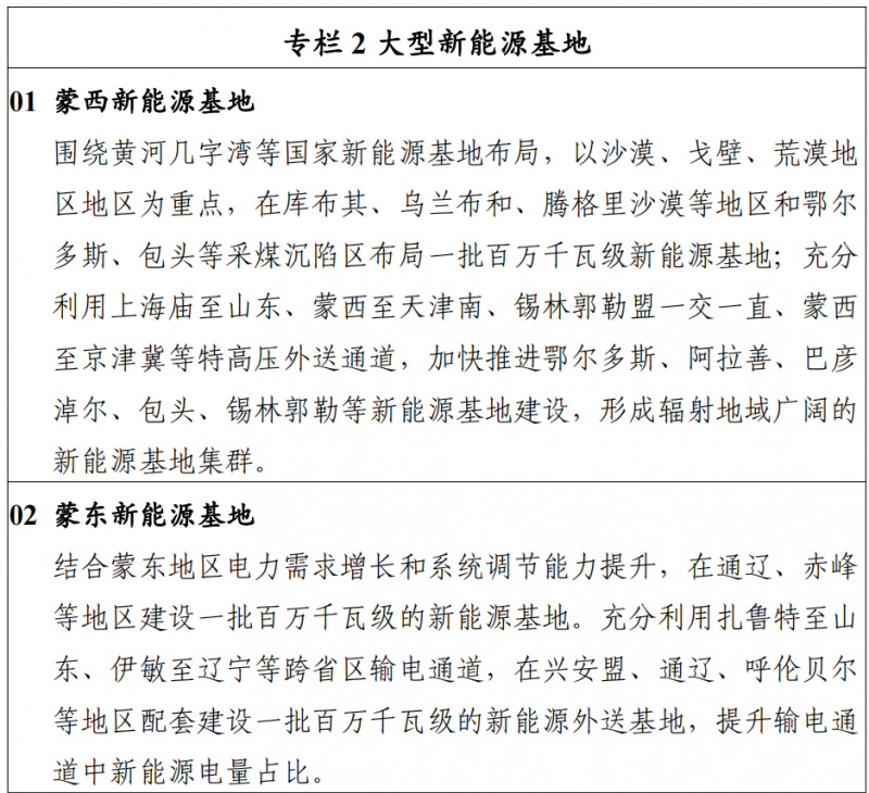 因地制宜推進(jìn)太陽(yáng)能熱發(fā)電發(fā)展??偨Y(jié)首批太陽(yáng)能熱發(fā)電示范項(xiàng)目建設(shè)經(jīng)驗(yàn),發(fā)揮太陽(yáng)能熱發(fā)電儲(chǔ)能調(diào)節(jié)能力和系統(tǒng)支撐能力,因地制宜建設(shè)太陽(yáng)能熱發(fā)電項(xiàng)目。充分發(fā)揮太陽(yáng)能熱發(fā)電在電力系統(tǒng)中調(diào)峰、調(diào)頻、儲(chǔ)能等多元功能,統(tǒng) 籌推動(dòng)太陽(yáng)能熱發(fā)電與風(fēng)電光伏基地一體化建設(shè)運(yùn)行,為新能源高比例自用和外送提供支撐,力爭(zhēng)“十四五”期間新增并網(wǎng)太陽(yáng)能熱發(fā)電項(xiàng)目 50 萬(wàn)千瓦。加快推進(jìn)新型儲(chǔ)能技術(shù)規(guī)?;瘧?yīng)用。探索采用自建、合建、租賃和共享等多元化模式,加快推動(dòng)新型儲(chǔ)能在發(fā)電側(cè)、 電網(wǎng)側(cè)、用戶側(cè)的規(guī)模化應(yīng)用,實(shí)現(xiàn)新能源與新型儲(chǔ)能的協(xié)同發(fā)展,原則上新建新能源項(xiàng)目要配置 15%(2 小時(shí))以上的儲(chǔ)能設(shè)施。研究出臺(tái)存量新能源項(xiàng)目增配儲(chǔ)能的管理辦法,推動(dòng)已并網(wǎng)的新能源項(xiàng)目增配儲(chǔ)能設(shè)施,提高消納和調(diào)峰能力。在充分發(fā)揮電力外送通道配套火電機(jī)組深度調(diào)峰能力的基礎(chǔ)上,合理規(guī)劃建設(shè)送端配套新型儲(chǔ)能設(shè)施,支撐大規(guī)模風(fēng)、光等可再生能源電源接入,提升外送通道可再生能源電量占比。二、充分提升可再生能源就地消納水平加快配套電網(wǎng)建設(shè)。優(yōu)化升級(jí)電網(wǎng)主網(wǎng)架,解決電網(wǎng)結(jié)構(gòu)性問(wèn)題,提升電力互濟(jì)能力,提高電網(wǎng)運(yùn)行效率和安全穩(wěn)定水平。加快推動(dòng)新能源送出工程建設(shè),滿足新能源大規(guī)模開(kāi)發(fā)的匯集與送出需求。推動(dòng)配電網(wǎng)擴(kuò)容改造和智能化升 級(jí),提升配電網(wǎng)柔性開(kāi)放接入能力、靈活控制能力和抗擾動(dòng)能力,增加電網(wǎng)就地就近平衡能力,構(gòu)建適應(yīng)分布式可再生能源并網(wǎng)和多元負(fù)荷需要的智能配電網(wǎng)。提升系統(tǒng)調(diào)節(jié)能力。積極推進(jìn)煤電靈活性改造,推動(dòng)自備電廠主動(dòng)參與調(diào)峰,加快建設(shè)天然氣調(diào)峰電站,充分提升系統(tǒng)調(diào)節(jié)能力。優(yōu)化電力調(diào)度運(yùn)行,合理安排系統(tǒng)開(kāi)機(jī)方式, 動(dòng)態(tài)調(diào)整各類電源發(fā)電計(jì)劃,探索推進(jìn)多種電源聯(lián)合調(diào)度。創(chuàng)新調(diào)度運(yùn)行與市場(chǎng)機(jī)制,促進(jìn)可再生能源在省級(jí)電網(wǎng)內(nèi)就地消納。三、穩(wěn)步有序推動(dòng)可再生能源外送消納充分發(fā)揮自治區(qū)可再生能源資源優(yōu)勢(shì)和區(qū)位優(yōu)勢(shì),按照提升一批、投產(chǎn)一批、開(kāi)工一批的發(fā)展思路,努力提高輸電 通道中新能源電量的占比,提高特高壓輸電通道利用率,大力提升可再生能源外送消納能力,有序推動(dòng)國(guó)家級(jí)新能源電力供應(yīng)保障基地建設(shè),助力全國(guó)碳達(dá)峰碳中和。“十四五” 期間,規(guī)劃新增新能源外送基地 2900 萬(wàn)千瓦,力爭(zhēng)累計(jì)投產(chǎn) 3900 萬(wàn)千瓦。加快推動(dòng)已批復(fù)新能源外送基地投產(chǎn)運(yùn)行。加快推動(dòng)錫林郭勒盟“一交一直”一期、上海廟至山東一期、扎魯特至青州特高壓輸電通道配套新能源基地、烏蘭察布風(fēng)電基地等已批復(fù)新能源基地建設(shè)進(jìn)度,力爭(zhēng) 2025 年前建成投產(chǎn) 1500 萬(wàn)千瓦左右。提升既有外送通道中新能源電量占比。提高自治區(qū)可再生能源外送規(guī)模,在蒙西至天津南交流特高壓、上海廟至山 東直流特高壓、錫林郭勒盟交直流特高壓等既有特高壓外送 輸電通道以及傳統(tǒng)火電廠外送專線基礎(chǔ)上,統(tǒng)籌送端周邊地區(qū)資源條件和環(huán)境約束,合理優(yōu)化風(fēng)能、太陽(yáng)能資源配置方 案,增配布局一批新能源基地,大幅提高存量外送輸電通道中可再生能源占比和通道利用效率,“十四五”期間建成外送新能源 1900 萬(wàn)千瓦。積極推進(jìn)新建蒙西外送通道配套新能源基地開(kāi)工建設(shè)。統(tǒng)籌優(yōu)化蒙西地區(qū)風(fēng)能、太陽(yáng)能資源和接入條件,在資源稟賦較好、開(kāi)發(fā)建設(shè)條件優(yōu)越、具備持續(xù)整裝開(kāi)發(fā)條件的地區(qū), 推進(jìn)風(fēng)能、太陽(yáng)能、煤炭等多能互補(bǔ)發(fā)展,有序建設(shè)一批百萬(wàn)千瓦級(jí)新能源基地,實(shí)現(xiàn)高比例可再生能源外送,力爭(zhēng)2025 年前推動(dòng)開(kāi)工配套新能源基地 1000 萬(wàn)千瓦。