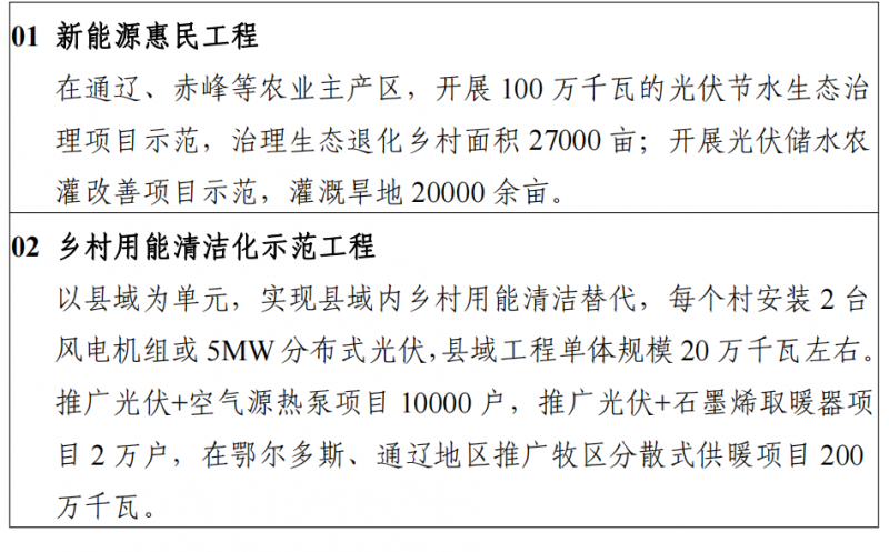 五、加快推動(dòng)農(nóng)村能源革命助力鄉(xiāng)村振興新能源惠民工程。開(kāi)展農(nóng)網(wǎng)鞏固提升工程,與提升風(fēng)電、光伏等分布式電能就近接入有機(jī)結(jié)合,提升鄉(xiāng)村電氣化水平,提高農(nóng)電服務(wù)水平,推進(jìn)農(nóng)網(wǎng)智能化。在電網(wǎng)基礎(chǔ)建設(shè)薄弱且用電負(fù)荷分散度較高的偏遠(yuǎn)末端配電網(wǎng)、農(nóng)區(qū)牧區(qū)等地區(qū),因地制宜推動(dòng)風(fēng)電、光伏開(kāi)發(fā)。在通遼、赤峰等盟市, 開(kāi)展光伏儲(chǔ)水農(nóng)灌改善工程和光伏節(jié)水生態(tài)治理工程示范, 提升電網(wǎng)農(nóng)灌期供電可靠性,構(gòu)建新型節(jié)水灌溉系統(tǒng),有效實(shí)現(xiàn)節(jié)水節(jié)能、生態(tài)恢復(fù)治理。自治區(qū)鄉(xiāng)村人口約 960 萬(wàn)人,開(kāi)展 100 萬(wàn)千瓦新能源惠民工程,滿足農(nóng)村牧區(qū)清潔用能需求。鄉(xiāng)村用能清潔化示范工程。推動(dòng)鄉(xiāng)村產(chǎn)業(yè)、農(nóng)業(yè)生產(chǎn)和農(nóng)村生活用能清潔化,以分布式光伏、分散式風(fēng)電、地?zé)崮芾脼楹诵?,開(kāi)展智慧用能大棚、清潔供暖、綠色出行等智慧用能示范。加快提升呼包鄂周邊、蒙東鄉(xiāng)村可再生能源供暖水平,合理配比分散式風(fēng)電和分布式光伏,利用電熱膜、電鍋爐、空氣源熱泵、石墨烯取暖器等供暖設(shè)施,形成清潔能源支持產(chǎn)業(yè)發(fā)展、產(chǎn)業(yè)發(fā)展助力鄉(xiāng)村振興的農(nóng)村安居環(huán) 境。在通遼、鄂爾多斯等農(nóng)牧區(qū),開(kāi)展牧區(qū)清潔供暖示范項(xiàng)目,探索離網(wǎng)式新能源供電供熱模式,滿足農(nóng)村牧區(qū)清潔用能需求。在蒙東地區(qū)人口密集的旗縣,充分利用當(dāng)?shù)亟斩捹Y源開(kāi)展生物質(zhì)發(fā)電供暖示范,實(shí)現(xiàn)旗縣區(qū)域生物質(zhì)供暖規(guī)模化替代,提升可再生能源消費(fèi)占比,推廣生物質(zhì)碳化與固化及高效低排節(jié)能爐具。