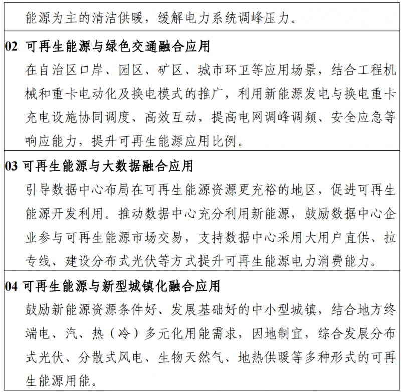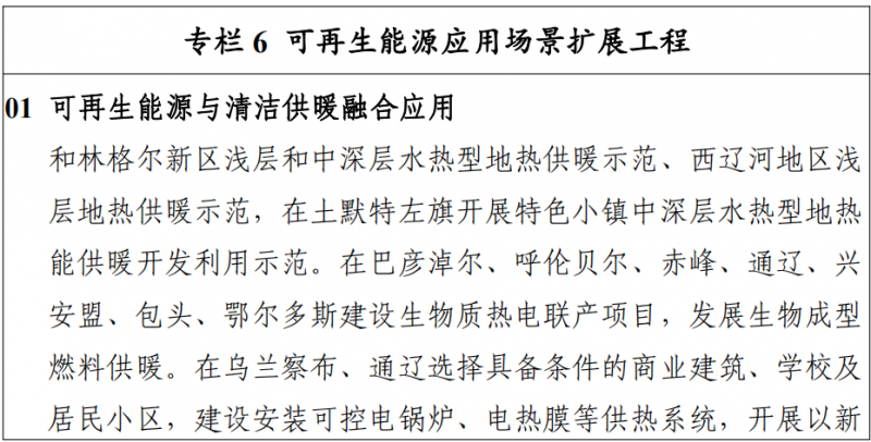 四、廣泛擴(kuò)展可再生能源應(yīng)用場(chǎng)景實(shí)施火電靈活性改造。加快存量煤電改造升級(jí),推廣深度調(diào)峰技術(shù)應(yīng)用,積極推進(jìn)現(xiàn)役煤電機(jī)組實(shí)施靈活性改造, 鼓勵(lì)新建煤電機(jī)組靈活性制造,降低新建煤電機(jī)組最小技術(shù)出力水平,提升電力系統(tǒng)整體消納能力,促進(jìn)新能源大規(guī)模開(kāi)發(fā)和高效利用,引導(dǎo)煤電由主力電源逐步向“支撐型”、“調(diào) 節(jié)型”電源轉(zhuǎn)變。推進(jìn)工業(yè)園區(qū)可再生替代。充分挖掘燃煤自備電廠園區(qū)的電源靈活調(diào)節(jié)能力和負(fù)荷側(cè)需求響應(yīng)能力,推動(dòng)園區(qū)自備電廠參與調(diào)峰,改變單一依靠自備火電的傳統(tǒng)供能方式,因地制宜推動(dòng)風(fēng)電、光伏建設(shè),鼓勵(lì)集中式與分布式并舉,在 不占用公共電網(wǎng)的消納空間且保證用能安全的前提下實(shí)現(xiàn) 新能源全額自發(fā)自用,逐步實(shí)現(xiàn)園區(qū)用能清潔化。開(kāi)展低碳工業(yè)園區(qū)示范。鼓勵(lì)具備新增負(fù)荷的園區(qū)開(kāi)展低碳工業(yè)園示范項(xiàng)目,以近零碳用能為目標(biāo),率先開(kāi)展全清潔能源供電,提升園區(qū)整體能效。通過(guò)自建分布式、新能源專線供電、綠色電力交易、綠證交易等多種方式,實(shí)現(xiàn)園區(qū)新增用電需求主要由新能源滿足。同時(shí),鼓勵(lì)園區(qū)通過(guò)配置儲(chǔ)能等措施,保證與園區(qū)負(fù)荷的匹配響應(yīng)和高比例自平衡, 不占用公共電網(wǎng)消納空間。推廣“綠電+綠氫”發(fā)展新模式。鼓勵(lì)采用具有適應(yīng)可再生能源出力波動(dòng)的綠色制氫技術(shù),加快推進(jìn)風(fēng)光氫儲(chǔ)一體化示范,推廣氫燃料電池汽車在礦山、物流、公交等領(lǐng)域的規(guī)?;瘧?yīng)用,積極探索氫能在冶金、化工、交通等領(lǐng)域的應(yīng)用。開(kāi)展源網(wǎng)荷儲(chǔ)一體化示范。充分挖掘和釋放生產(chǎn)側(cè)、消費(fèi)側(cè)調(diào)節(jié)能力,最大化發(fā)揮負(fù)荷側(cè)調(diào)節(jié)響應(yīng)能力,就近合理配套新能源,加強(qiáng)源網(wǎng)荷儲(chǔ)多向互動(dòng),通過(guò)電價(jià)優(yōu)勢(shì)帶動(dòng)儲(chǔ)能、大數(shù)據(jù)、新能源、新材料等行業(yè)全產(chǎn)業(yè)鏈發(fā)展。加快烏蘭察布、通遼源網(wǎng)荷儲(chǔ)一體化示范工程建設(shè),提升本地電源支撐,有效緩解供電缺口,推動(dòng)局部新能源就近消納,不占用公共電網(wǎng)調(diào)峰和消納空間,提升新能源開(kāi)發(fā)利用水平。持續(xù)推廣可再生能源清潔供暖。發(fā)揮自治區(qū)風(fēng)能、光伏、農(nóng)林、地?zé)豳Y源優(yōu)勢(shì),建立多元化可再生能源清潔供暖體系, 促進(jìn)環(huán)境質(zhì)量和人民生活條件改善。在呼包鄂城市群積極推動(dòng)中深層地?zé)崮芤?guī)?;┡痉叮瑒?chuàng)新城市用能新模式。在蒙東地區(qū)發(fā)展生物質(zhì)熱電聯(lián)產(chǎn)項(xiàng)目,探索以農(nóng)林生物質(zhì)、生物質(zhì)成型燃料等為燃料的生物質(zhì)鍋爐供熱方式,有效保護(hù)城鄉(xiāng)環(huán)境。在呼和浩特、包頭、烏蘭察布、通遼等地,開(kāi)展清潔電供暖示范。大力發(fā)展以新能源為主的綜合能源應(yīng)用。結(jié)合配電網(wǎng)、燃?xì)饩W(wǎng)、熱力網(wǎng)等能源網(wǎng)絡(luò),綜合可再生能源、儲(chǔ)能、信息通訊等先進(jìn)技術(shù),推動(dòng)分布式可再生能源高效靈活接入與生產(chǎn)消費(fèi)一體化,建設(shè)冷熱水電氣供應(yīng)的區(qū)域綜合能源系統(tǒng)。