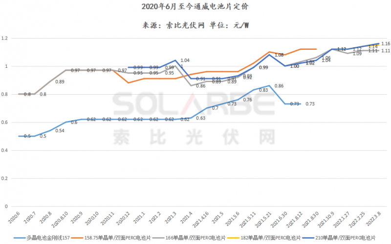 單晶 PERC 電池182(160μm 厚度)定價1.15元/瓦,上漲0.01元/瓦;