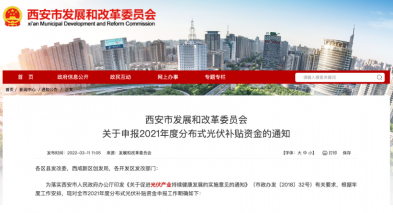 3月11日,陜西省西安市發(fā)改委發(fā)布關于申報2021年度分布式光伏補貼資金的通知。
