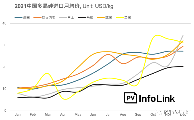 多晶硅市場在2021年經(jīng)歷了較大的動蕩,因整體光伏供應(yīng)鏈的產(chǎn)能錯配,使得硅料價格整年大都維持上漲態(tài)勢。除了中國國內(nèi)市場多晶硅交易價格上漲外,連帶使得價格相對平穩(wěn)的海外料價格也出現(xiàn)較大的波動,全年價格趨勢同樣呈現(xiàn)上升趨勢。PV Infolink透過統(tǒng)計2020 – 2021中國海關(guān)的多晶硅進口信息,分析變化原因與未來影響。
