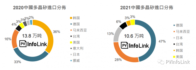 2021年進口多晶硅主要來自德國和馬來西亞,兩者占比達到了75%,主因兩國擁有瓦克和OCI兩家目前生產(chǎn)較為穩(wěn)定的非中國廠家。與2020年比較,出口多晶硅到中國的國家數(shù)量減少,且過去占據(jù)進口量第一名的韓國占比快速縮小,在韓國國內(nèi)生產(chǎn)設(shè)施目前沒有重啟的意愿下,預(yù)期未來占比將趨近于0%。其他來自日本或是臺灣的多晶硅進口,因該地區(qū)沒有多晶硅生產(chǎn)設(shè)施,可能是過去所簽訂的多晶硅長單未完全使用而轉(zhuǎn)售,但也僅有小量的占比。