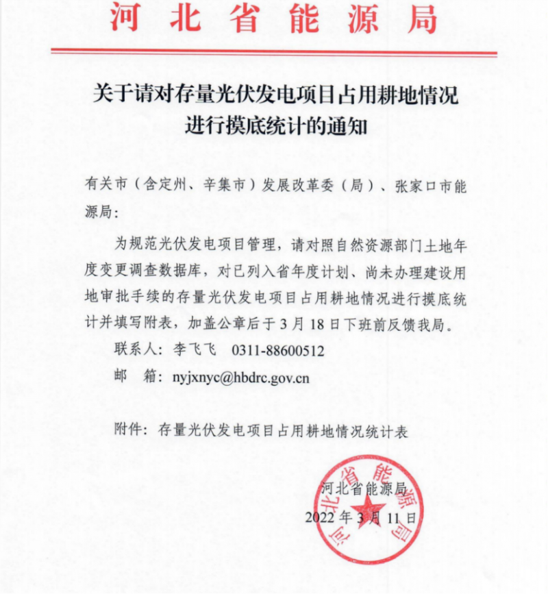 3月11日,河北省能源局啟動(dòng)存量光伏電站占用耕地摸底統(tǒng)計(jì)工作,文件要求對(duì)照自然資源部門土地年度變更調(diào)查數(shù)據(jù)庫(kù),對(duì)已列入省年度計(jì)劃、尚未辦理建設(shè)用地審批手續(xù)的存量光伏發(fā)電項(xiàng)目占用耕地情況進(jìn)行摸底統(tǒng)計(jì)。附表信息統(tǒng)計(jì)中包括項(xiàng)目名稱、開(kāi)發(fā)企業(yè)、備案證號(hào)、建設(shè)規(guī)模及地點(diǎn)、納入計(jì)劃批次以及場(chǎng)址總面積、已占用面積以及建設(shè)進(jìn)度等多項(xiàng)詳細(xì)信息。