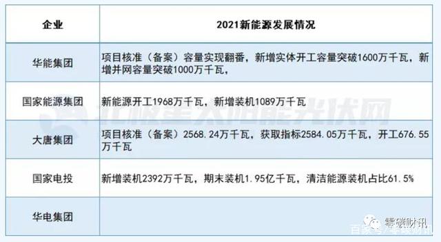 公開數(shù)據(jù)顯示,2021年,華能集團(tuán)實(shí)現(xiàn)新能源新增并網(wǎng)超1000萬千瓦,實(shí)體開工超1600萬千瓦、國家能源集團(tuán)新能源開工1968萬千瓦,新增裝機(jī)1089萬千瓦、大唐集團(tuán)新能源項(xiàng)目核準(zhǔn)(備案)2568.24萬千瓦,獲取指標(biāo)2584.05萬千瓦。