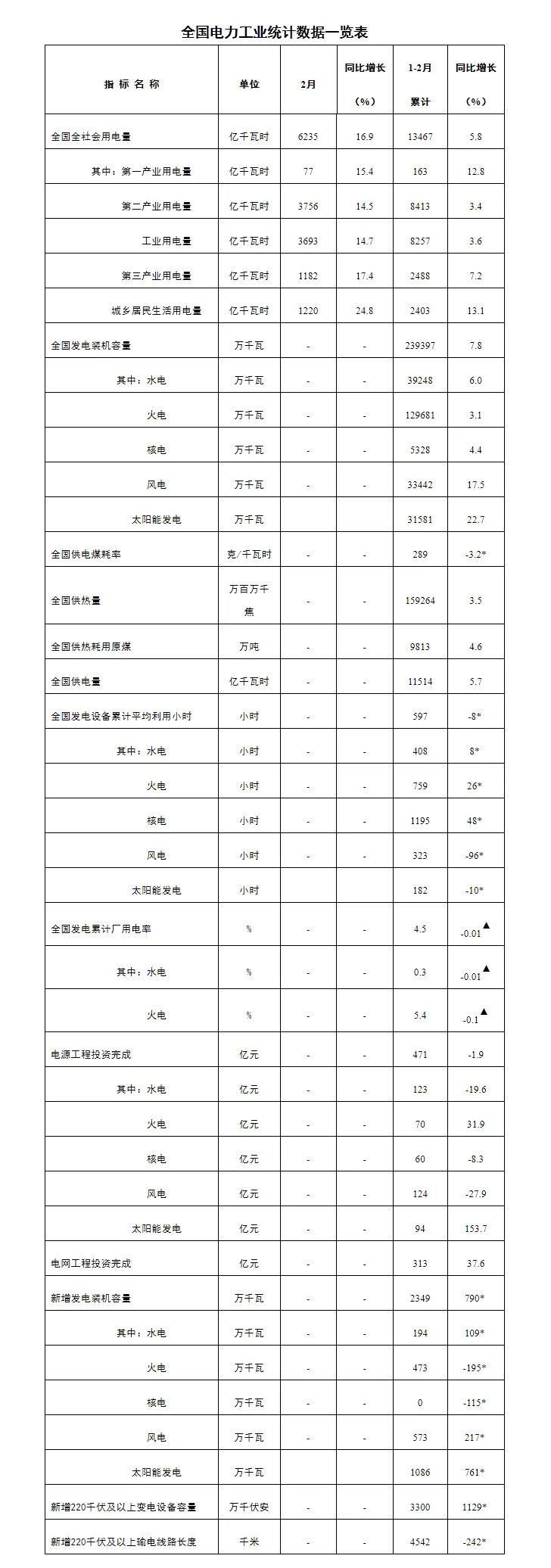 注:1.全社會用電量為全口徑數(shù)據(jù),全國供電量為調(diào)度口徑數(shù)據(jù)。2.“同比增長”列中,標(biāo)*的指標(biāo)為絕對量;標(biāo)▲的指標(biāo)為百分點(diǎn)。