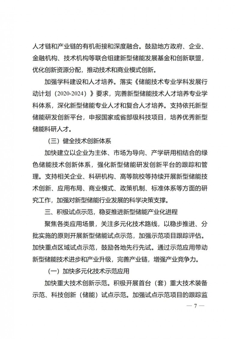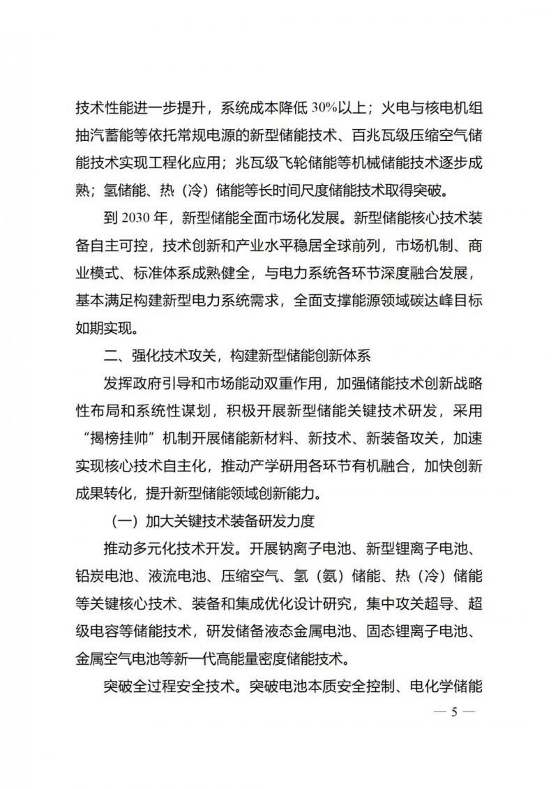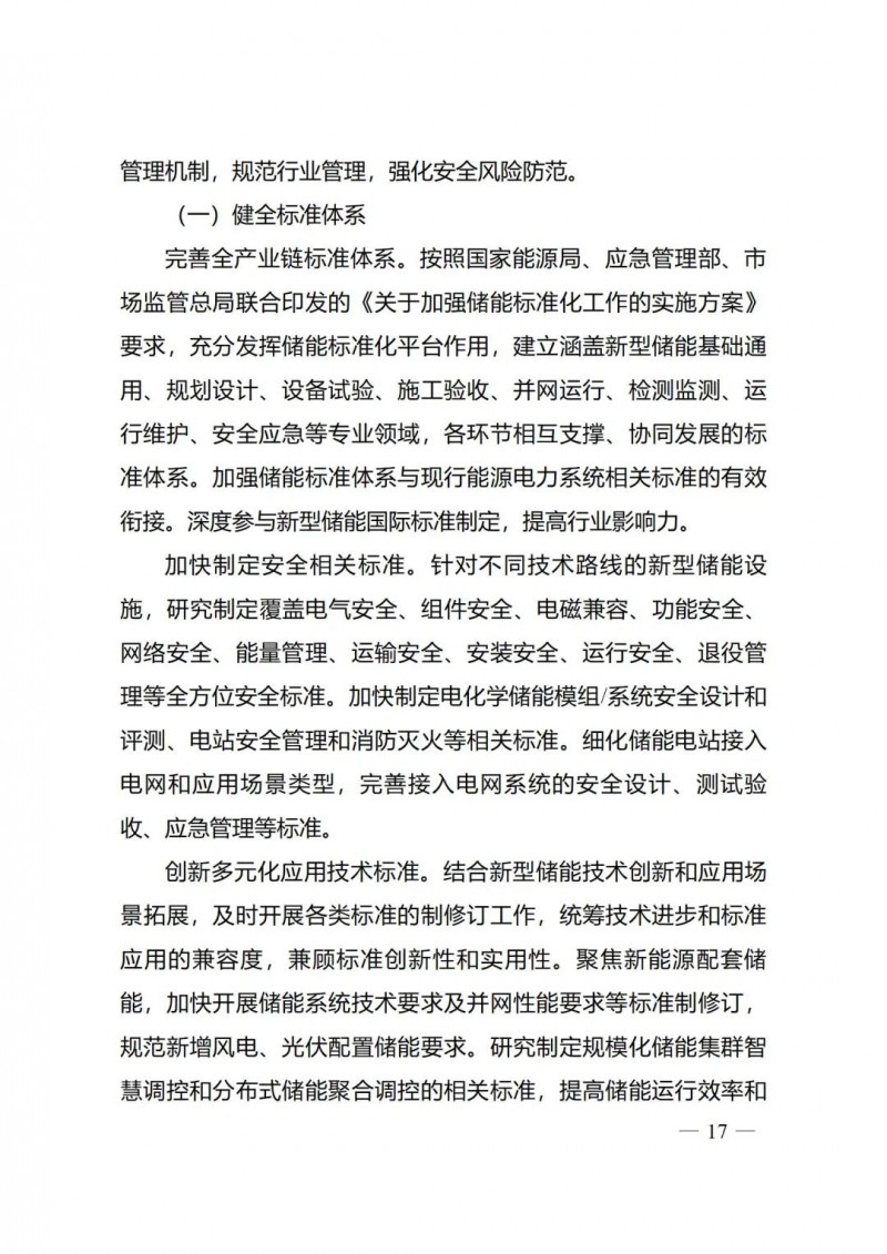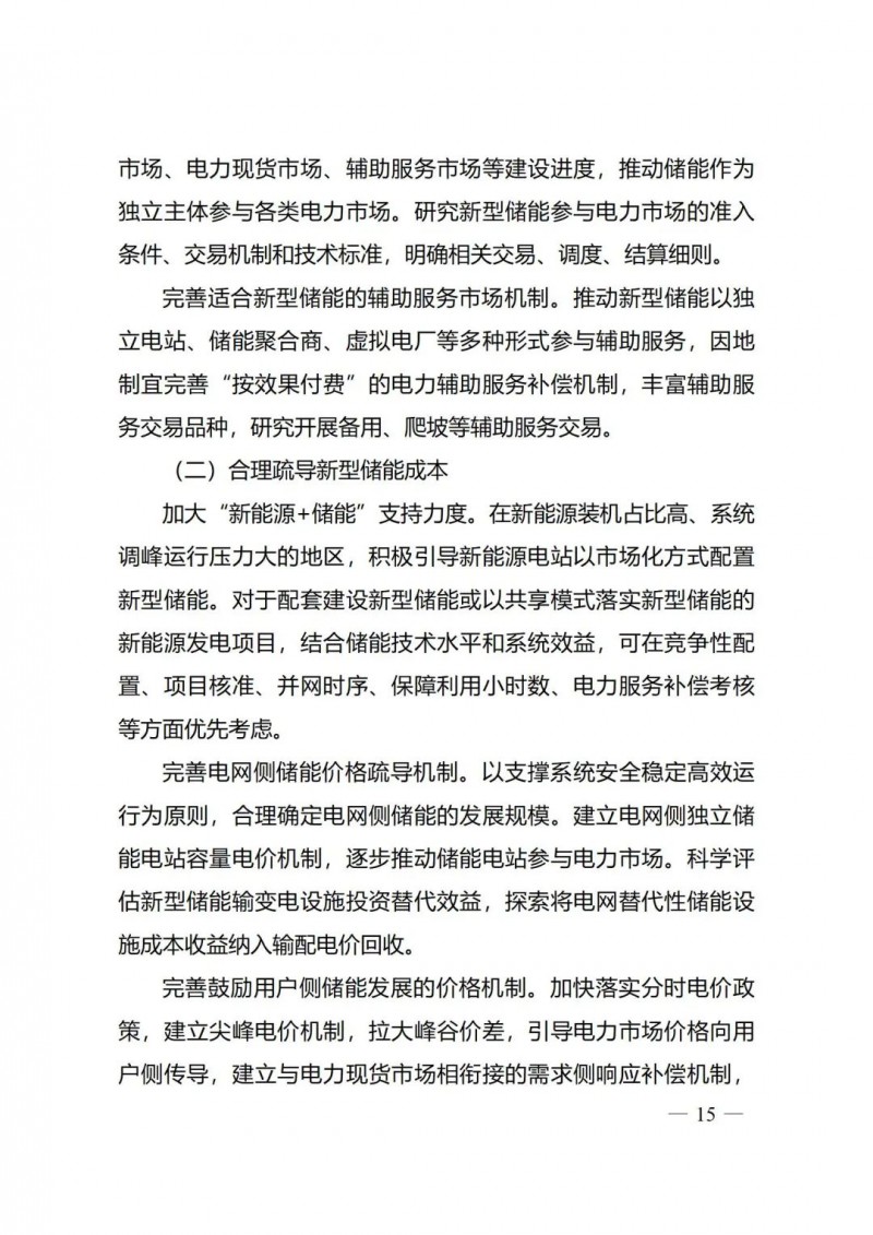 一)總體要求。一是指導思想中明確堅持以技術(shù)創(chuàng)新為內(nèi)生動力、以市場機制為根本依托、以政策環(huán)境為有力保障,穩(wěn)中求進推動新型儲能高質(zhì)量、規(guī)?;l(fā)展的總體思路。二是基本原則中充分體現(xiàn)了以規(guī)劃為引領(lǐng)、以創(chuàng)新為驅(qū)動、以市場為主導、以機制為保障、以安全為底線的發(fā)展思路,明確統(tǒng)籌規(guī)劃、因地制宜,創(chuàng)新引領(lǐng)、示范先行,市場主導、有序發(fā)展,立足安全、規(guī)范管理四項發(fā)展原則。三是在發(fā)展目標中,更注重通過支持技術(shù)和商業(yè)模式創(chuàng)新、健全標準體系、完善政策機制等措施,充分激發(fā)市場活力,推動構(gòu)建以需求為導向,以充分發(fā)揮新型儲能價值為目標的高質(zhì)量規(guī)?;l(fā)展格局。