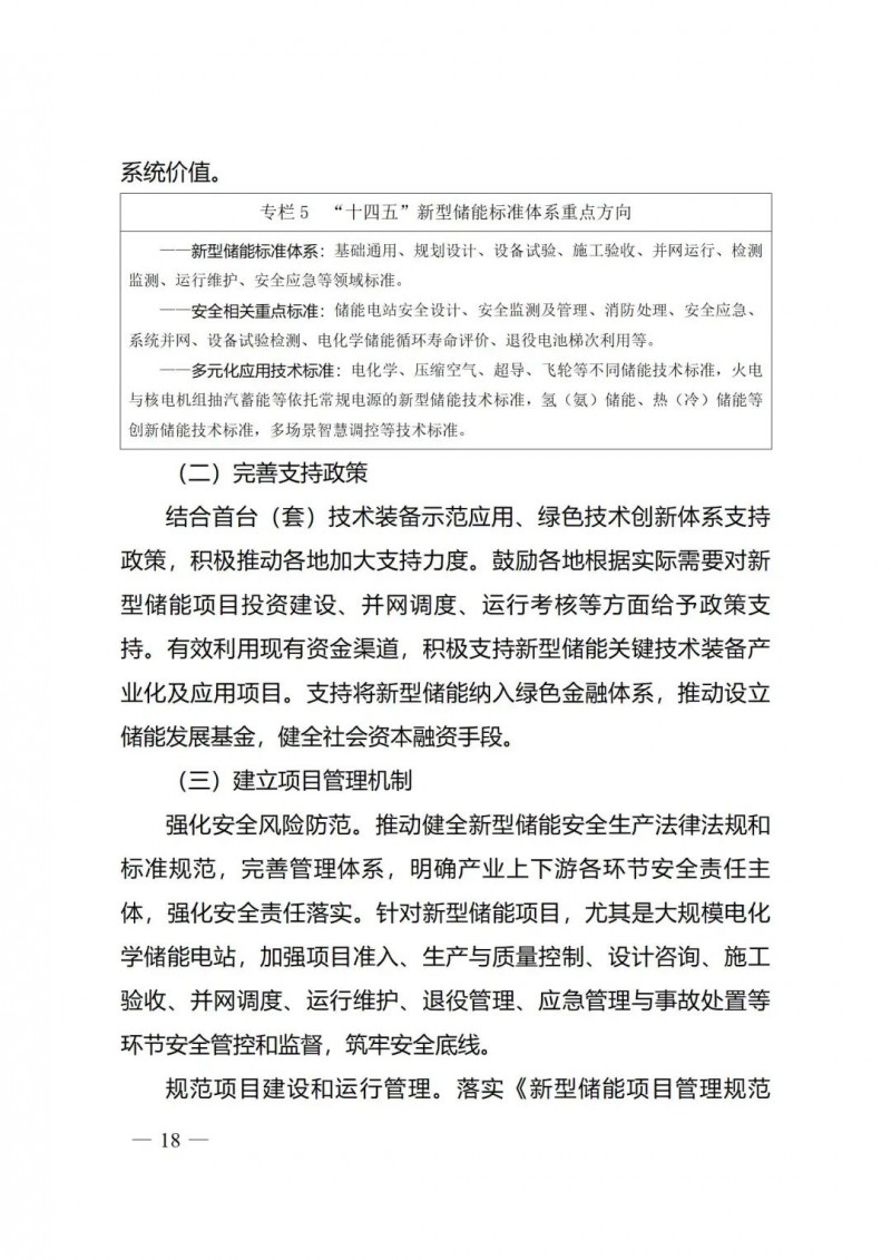五是著力健全新型儲能管理體系?!秾嵤┓桨浮窂娀瘶藴实囊?guī)范引領(lǐng)和安全保障作用,完善新型儲能全產(chǎn)業(yè)鏈標準體系,加快制定安全相關(guān)標準,開展多元化應用技術(shù)標準制修訂。要求加快建立新型儲能項目管理機制,規(guī)范行業(yè)管理,強化安全風險防范。鼓勵各地加大新型儲能技術(shù)創(chuàng)新和項目建設(shè)支持力度,完善相關(guān)支持政策。加快建立新型儲能項目管理機制,強化安全風險防范,規(guī)范項目建設(shè)和運行管理。