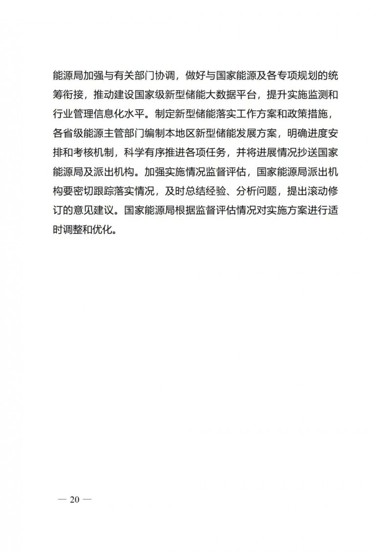 三)保障措施。為保障《實施方案》有效落地,提出系列具體保障措施。在協(xié)調(diào)保障方面,提出建立包含國家發(fā)展改革委、國家能源局與有關(guān)部門的多部門協(xié)調(diào)機制,做好與各項規(guī)模統(tǒng)籌銜接;在行業(yè)管理方面,提出建設(shè)國家級新型儲能大數(shù)據(jù)平臺,開展實施方案各項重點任務監(jiān)測,提升行業(yè)管理信息化水平;在責任落實方面,要求各省級能源主管部門編制新型儲能發(fā)展方案,明確各項任務進度和考核機制。同時,國家能源局根據(jù)監(jiān)督評估情況,適時對實施方案進行優(yōu)化調(diào)整。
