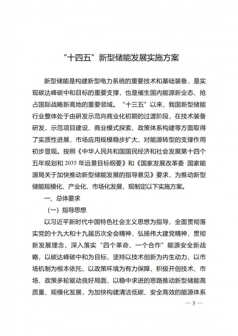 為深入貫徹落實“四個革命、一個合作”能源安全新戰(zhàn)略,實現(xiàn)碳達峰碳中和戰(zhàn)略目標,支撐構(gòu)建新型電力系統(tǒng),加快推動新型儲能高質(zhì)量規(guī)?;l(fā)展,根據(jù)《中華人民共和國國民經(jīng)濟和社會發(fā)展第十四個五年規(guī)劃和2035年遠景目標綱要》《國家發(fā)展改革委 國家能源局關(guān)于加快推動新型儲能發(fā)展的指導意見》有關(guān)要求,我們組織編制了《“十四五”新型儲能發(fā)展實施方案》,現(xiàn)印發(fā)給你們,請遵照執(zhí)行。