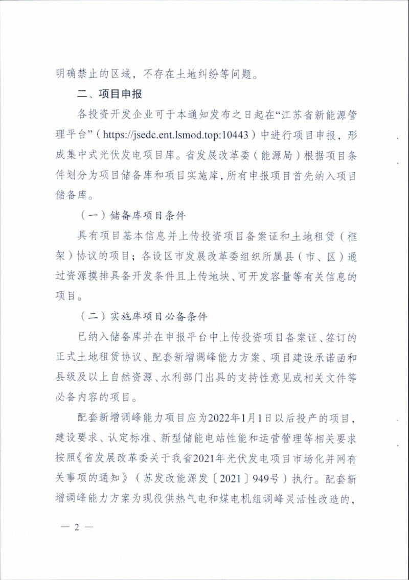 根據(jù)文件,本次申報(bào)主要為地面集中式光伏電站,項(xiàng)目應(yīng)選址明確,不涉及永久基本農(nóng)田、自然保護(hù)區(qū)以及無(wú)土地糾紛等。投資企業(yè)需在“江蘇省新能源管理平臺(tái)”進(jìn)行申報(bào),形成項(xiàng)目庫(kù),項(xiàng)目庫(kù)分為儲(chǔ)備和實(shí)施兩種類(lèi)型。