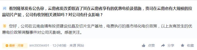 中環(huán)股份在接受媒體采訪時表示,云南取消隆基優(yōu)惠電價對公司沒有什么影響;而通威股份在接受媒體提問時則回應(yīng)稱,“我們沒有收到相關(guān)的通知”。