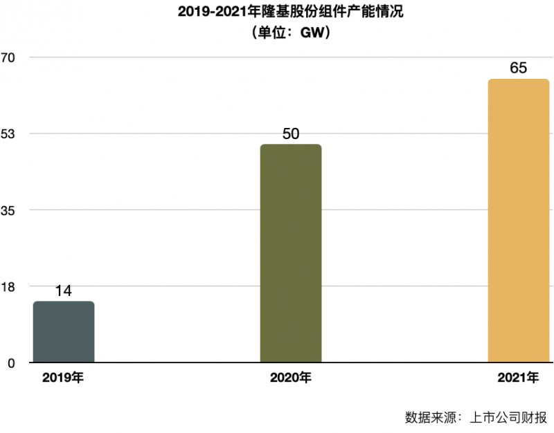 2019年,隆基單晶組件產(chǎn)能達(dá)到14吉瓦。根據(jù)2020年報公布數(shù)據(jù),其單晶組件銷量達(dá)到24.53吉瓦,組件產(chǎn)能更是達(dá)到50吉瓦,并計劃至2021年底達(dá)到65吉瓦。