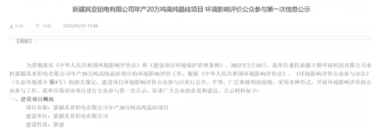 項(xiàng)目名稱:新疆其亞鋁電有限公司年產(chǎn)20萬噸高純晶硅項(xiàng)目