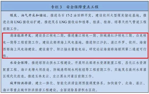 根據(jù)《實(shí)施方案》,北部灣城市群將開展安全保障重點(diǎn)工程,其中,清潔能源開發(fā)方面,將建設(shè)昌江核電二期,推進(jìn)廉江核電一期、防城港紅沙核電三期、白龍核電一期等工程前期工作。建設(shè)北部灣海上風(fēng)電基地,推進(jìn)陽江沙扒、湛江外羅、欽州、海南西部海上風(fēng)電場(chǎng)建設(shè)。建設(shè)南寧、陽江抽水蓄能電站,研究論證海南跨海聯(lián)網(wǎng)第二通道可行性。
