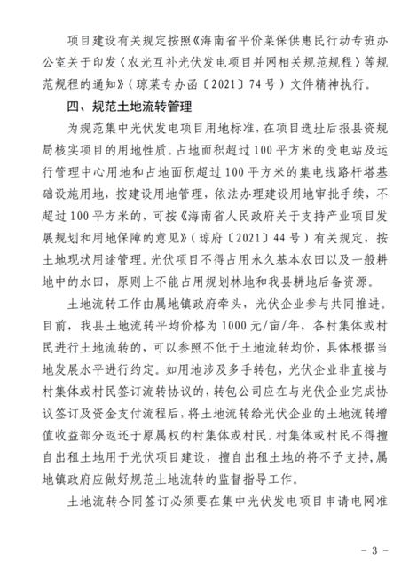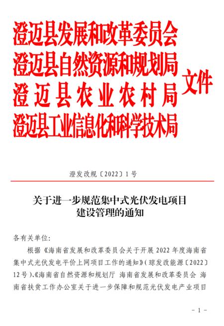 4月11日,澄邁縣發(fā)展和改革委員會(huì)、澄邁縣自然資源和規(guī)劃局、澄邁縣農(nóng)業(yè)農(nóng)村局、澄邁縣工業(yè)信息化和科學(xué)技術(shù)局聯(lián)合發(fā)布了《關(guān)于進(jìn)一步規(guī)范集中式光伏發(fā)電項(xiàng)目建設(shè)管理的通知》。本通知自2022年5月12日起施行,有效期2年。