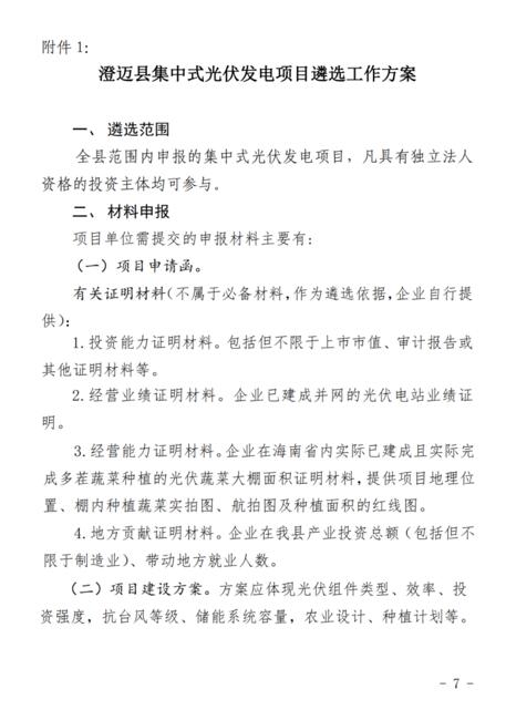 文件規(guī)定了澄邁縣集中式光伏發(fā)電項(xiàng)目應(yīng)納入省內(nèi)“十四五”能源發(fā)展規(guī)劃總規(guī)模,在全縣范圍內(nèi)實(shí)行總量控制,每年新增建設(shè)的集中式光伏發(fā)電項(xiàng)目總規(guī)模原則上不超過10萬千瓦。對(duì)有建設(shè)需求的企業(yè),向縣發(fā)改委集中進(jìn)行申報(bào),通過組織比選的方式遴選綜合評(píng)價(jià)最高的項(xiàng)目實(shí)施。