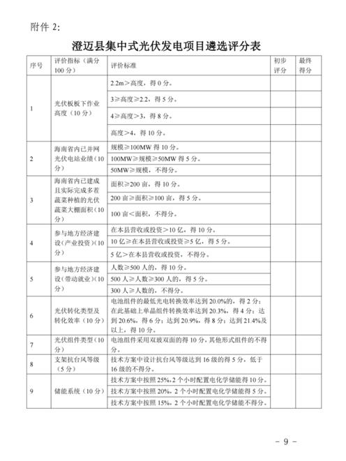 此外,根據(jù)澄邁縣集中式光伏發(fā)電項(xiàng)目遴選評(píng)分表,在澄邁縣營收或投資>10億,得10分;10億≥在本縣營收或投資≥5億,得5分;5億>在本縣營收或投資,不得分。配套儲(chǔ)能系統(tǒng)包括,技術(shù)方案中按照25%,2個(gè)小時(shí)配置電化學(xué)儲(chǔ)能得10分。按照20%,2個(gè)小時(shí)配置電化學(xué)儲(chǔ)能得5分。按照15%,2個(gè)小時(shí)配置電化學(xué)儲(chǔ)能不得分。