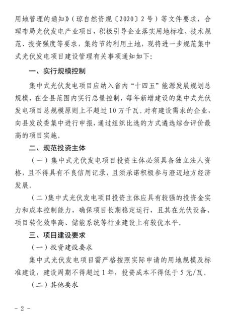 項(xiàng)目投資建設(shè)要求中,集中式光伏發(fā)電項(xiàng)目需嚴(yán)格按照實(shí)際申請(qǐng)的用地規(guī)模及標(biāo)準(zhǔn)建設(shè),建設(shè)周期不得超過1年,投資成本不得低于5元/瓦。