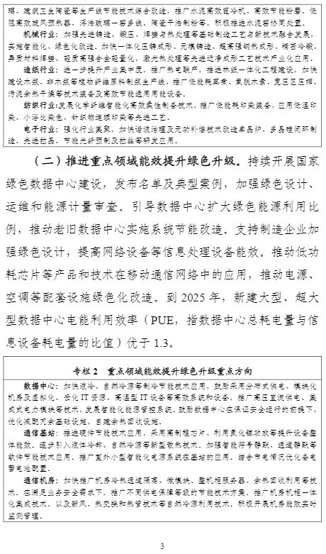 計劃提出,到2025年,重點工業(yè)行業(yè)能效全面提升,數(shù)據(jù)中心等重點領(lǐng)域能效明顯提升,綠色低碳能源利用比例顯著提高,節(jié)能提效工藝技術(shù)裝備廣泛應用,標準、服務和監(jiān)管體系逐步完善,鋼鐵、石化化工、有色金屬、建材等行業(yè)重點產(chǎn)品能效達到國際先進水平,規(guī)模以上工業(yè)單位增加值能耗比2020年下降13.5%。能盡其用、效率至上成為市場主體和公眾的共同理念和普遍要求,節(jié)能提效進一步成為綠色低碳的“第一能源”和降耗減碳的首要舉措。