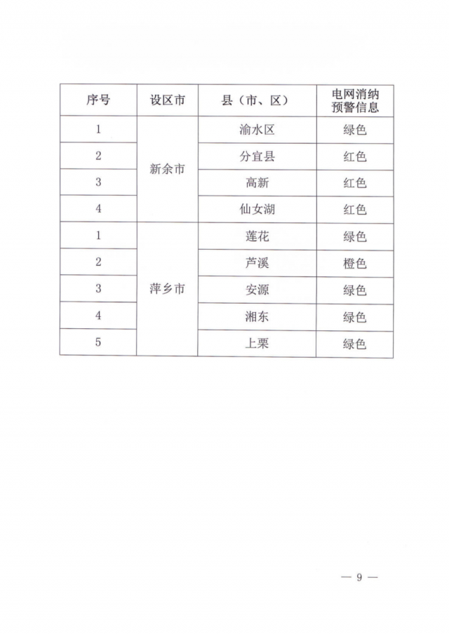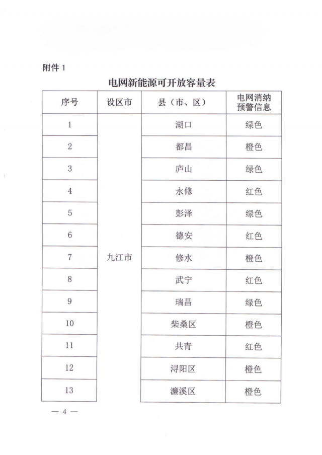 文件指出,由于新能源可開發(fā)容量呈現(xiàn)飽和狀態(tài),故給出部分市縣電網(wǎng)新能源可開放容量表。江西的94個(gè)縣市區(qū)中,已經(jīng)有27個(gè)電網(wǎng)消納預(yù)警信息為紅色,12個(gè)為橙色。