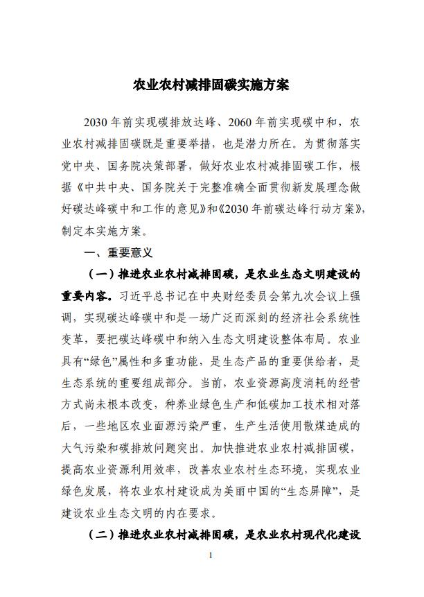 為貫徹落實(shí)碳達(dá)峰碳中和重大決策部署,推進(jìn)農(nóng)業(yè)農(nóng)村綠色低碳發(fā)展,我們制定了《農(nóng)業(yè)農(nóng)村減排固碳實(shí)施方案》,現(xiàn)印發(fā)你們,請(qǐng)結(jié)合實(shí)際貫徹落實(shí)。