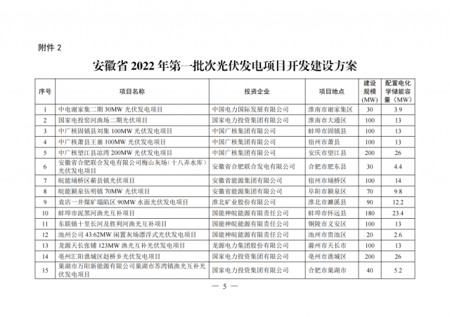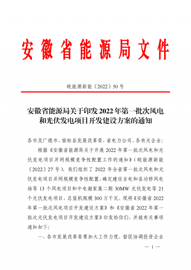 6月20日,安徽省能源局正式下發(fā)了《關(guān)于2022年第一批次風(fēng)電和光伏發(fā)電項(xiàng)目開發(fā)建設(shè)方案》的通知。根據(jù)該通知,安徽省2022年全省第一批次風(fēng)電和光伏發(fā)電項(xiàng)目并網(wǎng)規(guī)模競爭性配置,確定建設(shè)21個(gè)光伏發(fā)電項(xiàng)目和13個(gè)風(fēng)電項(xiàng)目,總裝機(jī)規(guī)模300萬千瓦,其中光伏200萬千瓦、風(fēng)電100萬千瓦。