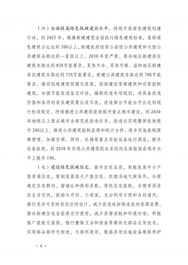 《方案》指出,全面提高綠色低碳建筑水平。持續(xù)開展綠色建筑創(chuàng)建行動,到2025年,城鎮(zhèn)新建建筑全面執(zhí)行綠色建筑標準,星級綠色建筑占比達到30%以上,新建政府投資公益性公共建筑和大型公共建筑全部達到一星級以上。2030年前嚴寒、寒冷地區(qū)新建居住建筑本體達到83%節(jié)能要求,夏熱冬冷、夏熱冬暖、溫和地區(qū)新建居住建筑本體達到75%節(jié)能要求,新建公共建筑本體達到78%節(jié)能要求。推動低碳建筑規(guī)?;l(fā)展,鼓勵建設零碳建筑和近零能耗建筑。