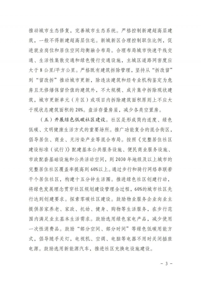 《方案》提出開展綠色低碳社區(qū)建設。推廣功能復合的混合街區(qū),倡導居住、商業(yè)、無污染產(chǎn)業(yè)等混合布局。按照《完整居住社區(qū)建設標準(試行)》配建基本公共服務設施、便民商業(yè)服務設施、市政配套基礎設施和公共活動空間,到2030年地級及以上城市的完整居住社區(qū)覆蓋率提高到60%以上。通過步行和騎行網(wǎng)絡串聯(lián)若干個居住社區(qū),構(gòu)建十五分鐘生活圈。推進綠色社區(qū)創(chuàng)建行動,將綠色發(fā)展理念貫穿社區(qū)規(guī)劃建設管理全過程,60%的城市社區(qū)先行達到創(chuàng)建要求。探索零碳社區(qū)建設。鼓勵物業(yè)服務企業(yè)向業(yè)主提供居家養(yǎng)老、家政、托幼、健身、購物等生活服務,在步行范圍內(nèi)滿足業(yè)主基本生活需求。鼓勵選用綠色家電產(chǎn)品,減少使用一次性消費品。鼓勵“部分空間、部分時間”等綠色低碳用能方式,倡導隨手關燈,電視機、空調(diào)、電腦等電器不用時關閉插座電源。鼓勵選用新能源汽車,推進社區(qū)充換電設施建設。