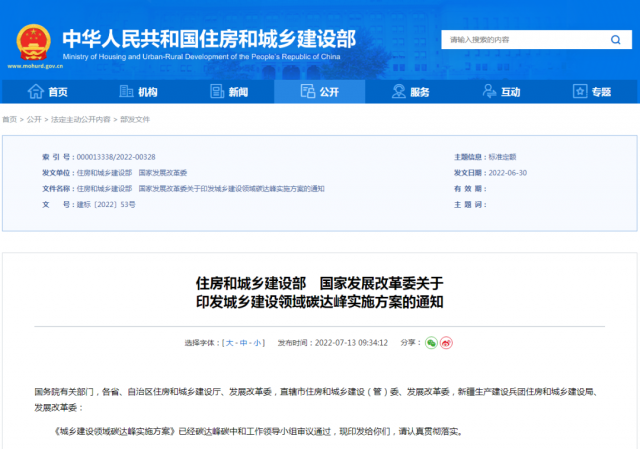 印發(fā)城鄉(xiāng)建設領域碳達峰實施方案的通知