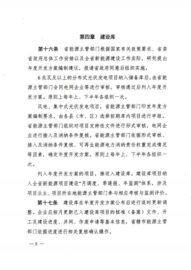 列入年度開發(fā)方案的項(xiàng)目,推送入建設(shè)庫。建設(shè)庫項(xiàng)目納入全省新能源項(xiàng)目建設(shè)“月調(diào)度、季通報(bào)、年監(jiān)測(cè)”體系,涉及項(xiàng)目業(yè)主、項(xiàng)目所在地能源主管部門參與相應(yīng)考核與監(jiān)測(cè)評(píng)價(jià)。