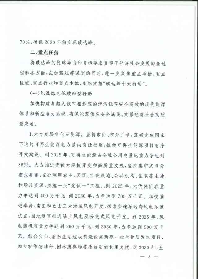 能源綠色低碳轉(zhuǎn)型行動提出,到2025年,可再生能源占全社會用電量比重力爭達到36%。堅持集中式與分布式并重,實施一批“光伏+“工程。到2025年,光伏裝機容量力爭達到400萬千瓦;到2030年,力爭達到700萬千瓦。加快推進奉賢、南匯和金山三大海域風電開發(fā),探索實施深遠海風電示范試點,因地制宜推進陸上風電及分散式風電開發(fā)。到2025年,風電裝機容量力爭達到260萬千瓦;到2030年,力爭達到500萬千瓦。結(jié)合寶山、浦東生活垃圾焚燒設(shè)施新建一批生物質(zhì)發(fā)電項目,到2030年,生物質(zhì)發(fā)電裝機容量達到84萬千瓦。