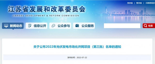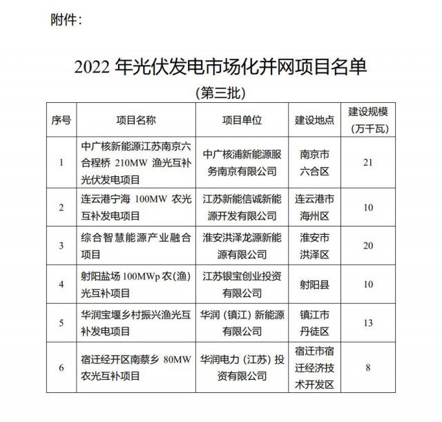 為積極貫徹落實國家“碳達峰碳中和”長期目標,推動我省光伏發(fā)電平穩(wěn)有序發(fā)展,按照《省發(fā)展改革委關于開展2022年光伏發(fā)電市場化并網項目開發(fā)建設的通知》(蘇發(fā)改能源發(fā)〔2022〕350號)有關要求,現(xiàn)將我省2022年光伏發(fā)電市場化并網項目(第三批)名單予以公布。