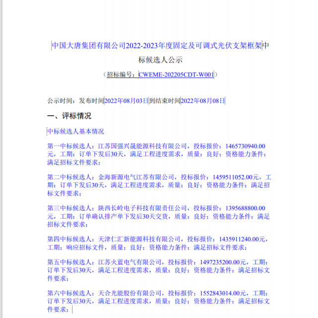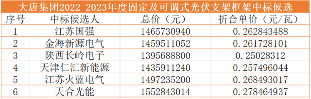 8月3日,大唐集團公示了2022-2023年度固定及可調式光伏支架框架中標候選人,江蘇國強興晟能源、金海新源電氣、陜西長嶺電子科技、天津仁匯新能源、江蘇火藍電氣、天合光能6家光伏支架供應商入圍。