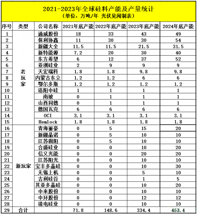 2021年以來,硅料老玩家大舉擴(kuò)產(chǎn),新玩家實力雄厚如過江之鯽,這一輪硅料牛市涌現(xiàn)了將近30家硅料企業(yè)。光伏見聞根據(jù)公開消息不完全統(tǒng)計,2022年底,硅料企業(yè)新老玩家產(chǎn)能將達(dá)到148.6萬噸,2023年底,硅料企業(yè)產(chǎn)能則將達(dá)到334.4萬噸,如果產(chǎn)能完全釋放,保守估計這些硅料可生產(chǎn)的組件則分別為505GW、1136GW。