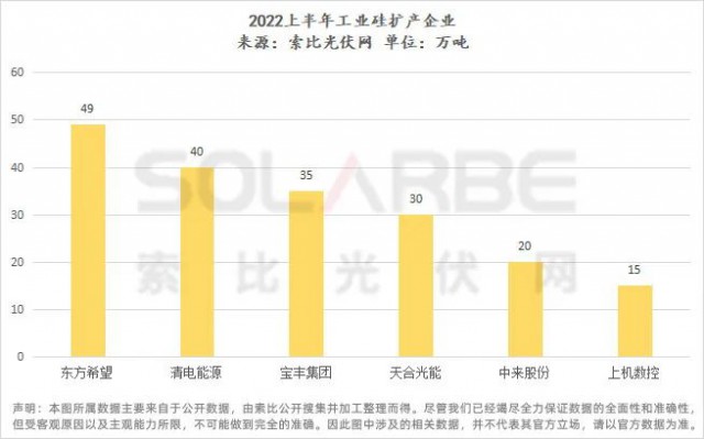 經(jīng)公開信息統(tǒng)計(jì),東方希望、清電能源、寶豐集團(tuán)、天合光能、中來股份、上機(jī)數(shù)控六家企業(yè)上半年共計(jì)擴(kuò)產(chǎn)189萬噸工業(yè)硅,且工業(yè)硅擴(kuò)產(chǎn)規(guī)模均超出配套多晶硅產(chǎn)量。
