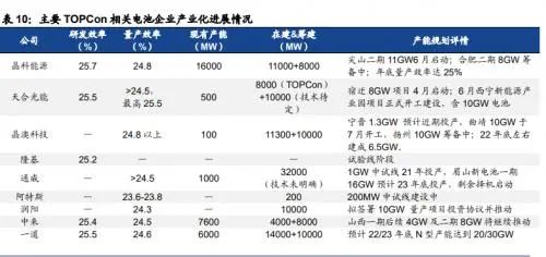 組件端龍頭引領(lǐng),TOPCon進(jìn)入規(guī)?;慨a(chǎn)元年,溢價(jià)下經(jīng)濟(jì)性初現(xiàn),國(guó)海證券列舉了各大龍頭布局情況: