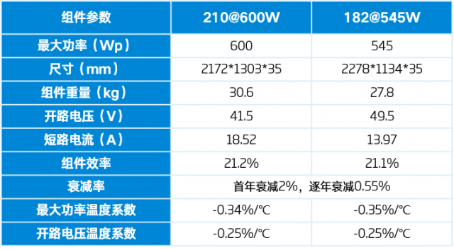 擬采用210硅片組件600W,182硅片組件545W進(jìn)行行排布對比,各組件參數(shù)如下:
