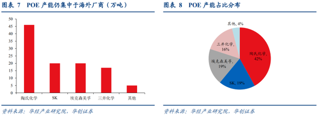 目前全球范圍內(nèi)POE產(chǎn)能十分集中,產(chǎn)能主要集中在陶氏、埃克森美孚、三井、SK等公司,其中陶氏產(chǎn)能46萬(wàn)噸,占全球產(chǎn)能的42%;埃克森美孚和SK,產(chǎn)能均為20萬(wàn)噸,占比均為19%,三井化學(xué)擁有17萬(wàn)噸的產(chǎn)能,產(chǎn)能占比約16%。