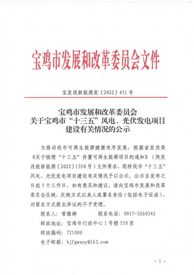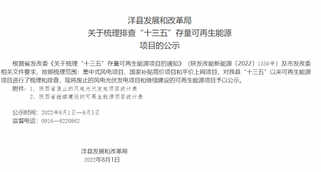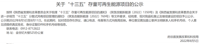 根據(jù)省發(fā)展改革委《關(guān)于梳理“十三五”存量可再生能源項(xiàng)目的通知》(陜發(fā)改能新能源〔2022〕1350號)文件要求,現(xiàn)將我市擬上報(bào)省發(fā)改委“十三五”風(fēng)電、光伏發(fā)電項(xiàng)目建設(shè)有關(guān)情況予以公示。公示自發(fā)布之日起5個(gè)工作日,如有意見和建議,請向渭南市發(fā)展和改革委員會反映,反映方式以來人或署名來信(包括電子信函),對匿名方式提出異議的不予受理。
